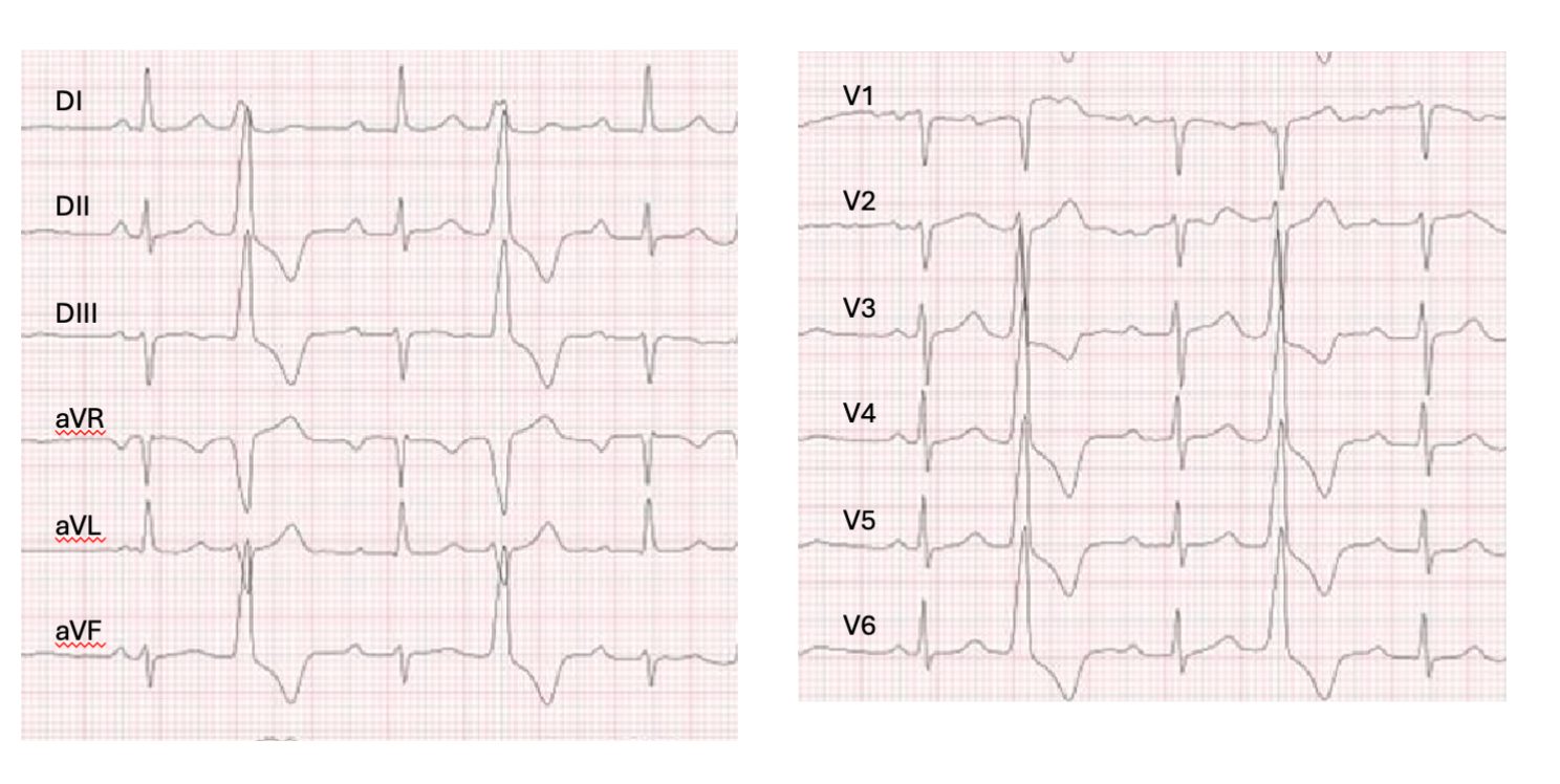 Il tracciato riporta una breve sequenza di aritmia da extrasistolia ventricolare a cadenza bigemina, ad accoppiamento costante. La morfologia dei BEV è caratteristica per origine dal tratto di efflusso del ventricolo destro (si noti la morfologia a tipo blocco di branca sinistro nelle precordiali e l’asse strettamente verticale diretto dall’alto al basso nelle derivazioni periferiche). Successivamente ai battiti ectopici, il primo complesso evidenzia una attivazione cardiaca in toto e la corrispondente ripolarizzazione ventricolare che rientrano nei limiti di normalità. Una attenta valutazione evidenzia un evidente prolungamento dell’intervallo PR dopo ogni extrasistole: il fenomeno può sfuggire ad uno sguardo affrettato, ma è frequentemente ritrovabile nella comune aritmologia elettrocardiografica.