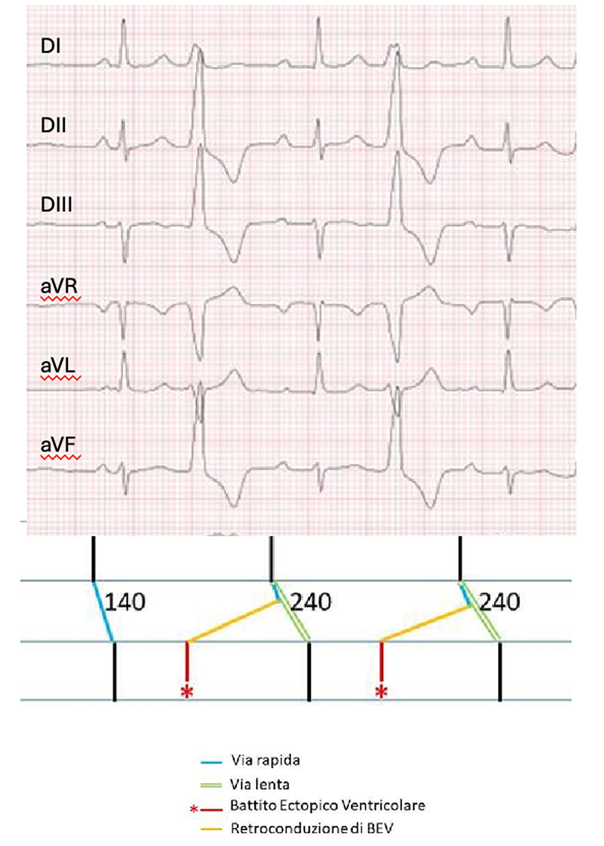 L’intervallo PR post extrasistolico (240 msec) è consistentemente più lungo rispetto al basale (140 msec). Il diagramma di Shamroth evidenzia come il fenomeno sia dovuto alla conduzione occulta retrograda del battito ectopico sulla via rapida della giunzione atrio-ventricolare: tale via viene depolarizzata senza che l’impulso riesca ad attivare gli atri. La depolarizzazione occulta, selettiva per la via rapida, determina l’impossibilità di questa ultima nel condurre il successivo impulso sinusale che pertanto utilizzerà la via lenta per arrivare ai ventricoli. Il risultato di questo «salto» di via è appunto il prolungamento dell’intervallo PR. Il fenomeno della conduzione occulta retrograda dei battiti ectopici ventricolari deve essere riconosciuto in quanto in alcuni casi si rende responsabile di battiti reciproci se non addirittura dell’innesco di rientri giunzionali veri e propri.