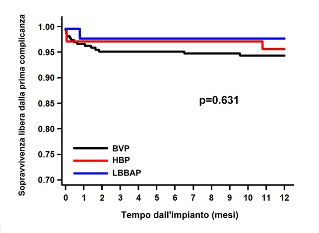 In totale sono stati arruolati 373 pazienti (75.3±8.7 anni, 53.9% maschi, 68.9% con classe NYHA≥III): 263 con BVP, 68 con HBP e 42 con LBBAP. Le caratteristiche basali dei tre gruppi erano simili. Rispetto a BVP e HBP, LBBAP era associato a tempi procedurali e fluoroscopici medi più brevi e a soglie di cattura acuta significativamente più basse (tutte le p <0.05). Ad un follow-up mediano di 12 mesi, LBBAP ha mantenuto le soglie di cattura più basse e si associava ad una longevità residua stimata della batteria significativamente più lunga (tutte le p <0.05). Al follow-up i tre gruppi di studio mostravano un rischio simile di complicanze correlate al dispositivo (5.7%, 4.4% e 2.4% rispettivamente per BVP, HBP e LBBAP; p=0.650, vedi la Figura) e di ospedalizzazione per scompenso cardiaco (2.7 %, 1.5% e 2.4% rispettivamente per BVP, HBP e LBBAP; p=0.850).
